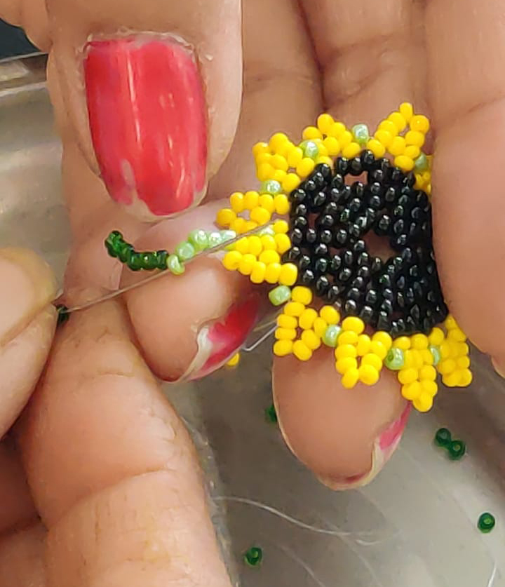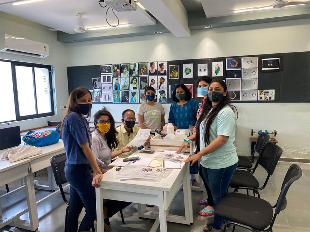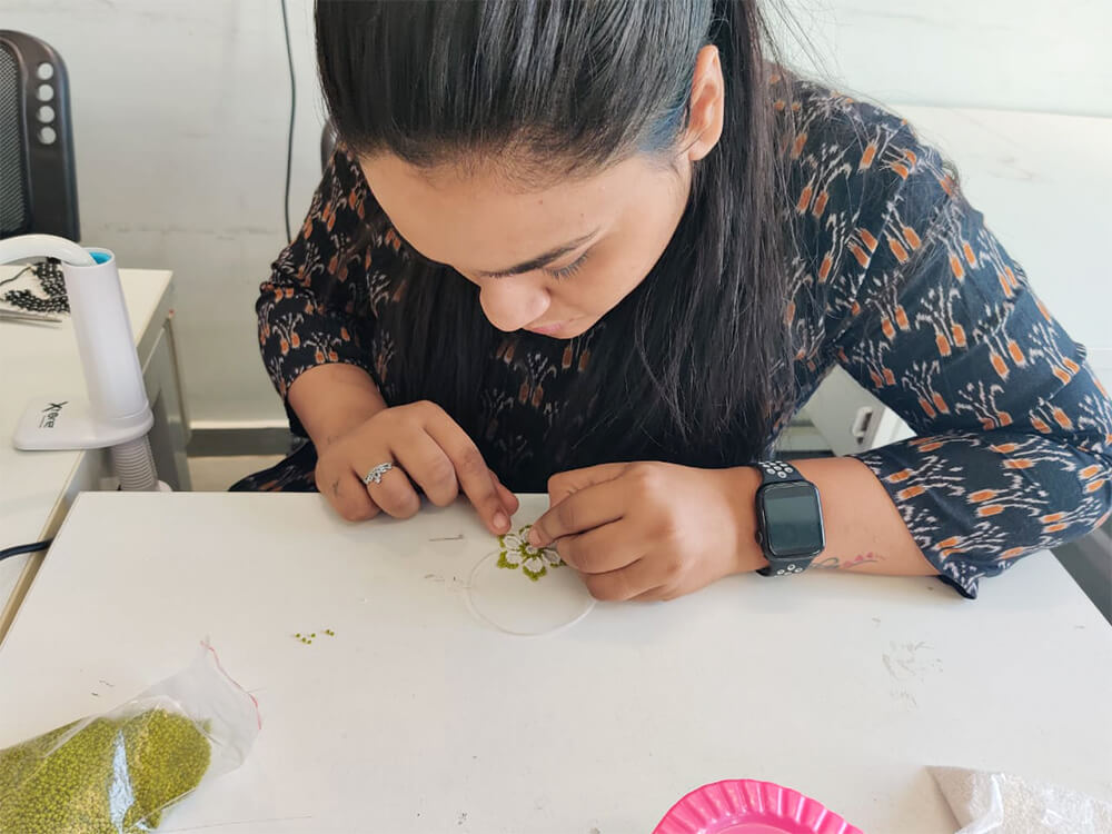 Different beading techniques including ganthan, pirona, stringing, usage of seed beads is taught to the students by a visiting artisan. Old techniques are taught and design development is done in-corporating contemporary style.