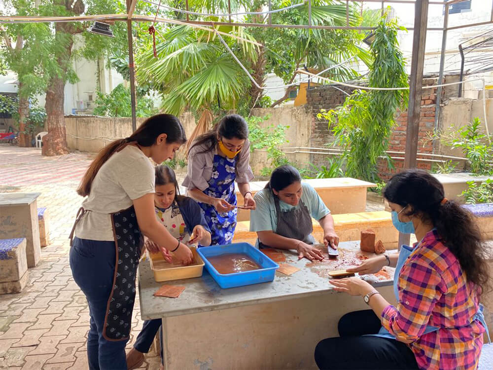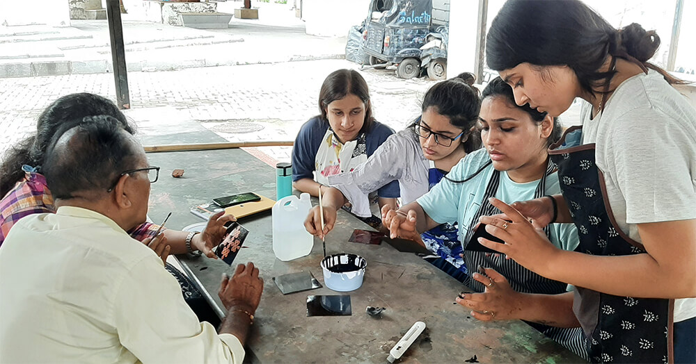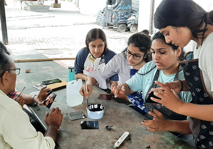 Etching is a surface ornamentation technique in which chemical is used to etch away a precribed design on the surface of a metal. Different techniques of etching are taught by a professional artisan. Here students get a hands-on experience with the particular method.